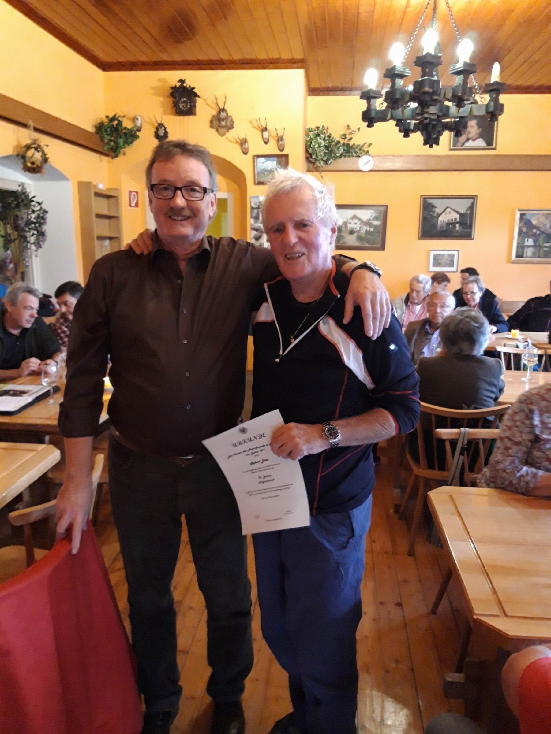 In seiner weiteren Ausführung zeigte sich Karl Burg über den Erfolg des traditionellen Anningerkirtags sehr zufrieden und gab bereits bekannt, dass der Anningerkirtag 2019 diesmal wieder auf beiden Schutzhäusern an einem Sonntag im Juni stattfindet, unter der Patronanz der Gemeinde Guntramsdorf. Nach seinem Resümee gab der langjährige Obmann Burg bekannt, dass er im kommenden Jahr, bei der Vorstandswahl im April 2019, nicht mehr kandidieren wird. Zum Abschluss der Sitzung wurde die Ehrung langjähriger Mitglieder vorgenommen. So erhielten das Silberne Vereinsabzeichen für 25-jährige Mitgliedschaft Lucas Drev und Robert Drev sowie DI Alfred Freunschlag. Mit dem Goldenen Vereinsabzeichen für 35-jährige Mitgliedschaft wurde der anwesende Karl Fornezzi geehrt.